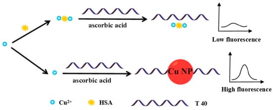 The principle of the detection method is illustrated in Scheme 1. Our experimental method selected Poly T strand (T40) as the template for CuNPs formation [37]. Under normal circumstances, Cu2+ could be reduced to Cu0 by Vc, which reacts with T40 to form the poly T-templated CuNPs and generates a strongly fluorescent signal. However, in the presence of HSA, it will absorb the Cu2+ to prevent the reduction reaction by ascorbic acid. As the result, poly T-templated CuNPs could not be formed after adding T40 to the reaction solution, which meant that the mixture could not generate nearly the same fluorescence intensity. Therefore, we were able to detect the concentration of HSA by monitoring the variation in fluorescence intensity.
