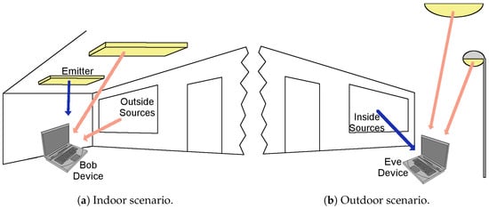 Generally speaking, up until recently, VLC-based solutions were considered a secure way to communicate information since “light could not go through walls”. However, when we consider that most habitats have some window, due to design or regulatory requirements, we have to start thinking that, at least, some information leakage will occur even when some interference sources are emitting to obscure the signal, as has been proposed in [4,5]. These interference sources could be circumvented by directing the focus of the eavesdropper to the real emitter.