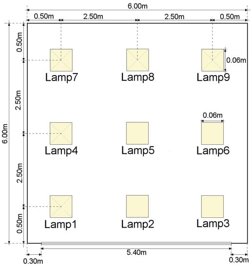 For the environment simulation. a basic scenario proposed in the literature [17,18,19] was used. Distribution of luminaries and room configuration is shown in Figure 3. Further details can be found on Section 5.1.