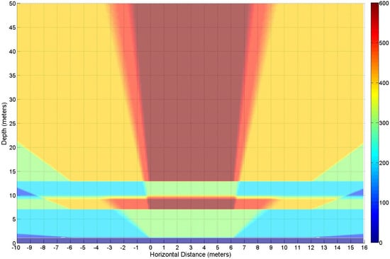 The definition of potential attack zones was based on pure geometrical considerations and assuming an LOS approach. A slice-based graph will be presented, showing how the number of available lamps varies depending on the position of the eavesdropper. The result of this first step, number of LEDs seen by the receiver using an LOS approach, is shown in Figure 4. It should be noted that, in the first 20 cm closest to the “window”, the number of LEDs viewed is zero.