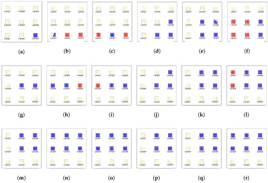LEDs viewed from the receiver’s position: (a) S1; (b) S2; (c) S3; (d) S4; (e) S5; (f) S6; (g) S7; (h) S8; (i) S9; (j) S10; (k) S11; (l) S12; (m) S13; (n) S14; (o) S15; (p) S16; (q) S17; and (r) S18 as listed in Table 1. Blue points represent the LEDs viewed by the receiver with an FOV of . Red points represent the LEDs viewed by the receiver, in addition to the blue ones, when the receiver has an FOV of .