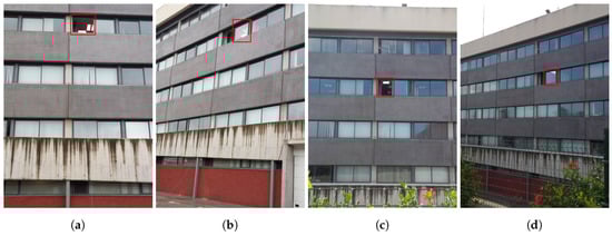 Pictures of the target emitter from the diferent locations where the sniffer was positioned: (a) T1; (b) T2; (c) T3; and (d) T4 as defined in Table 2. In (b,d), it can be observed that the double panel window is between the emitter and the receiver. In (a,c), the receiver has a clear and direct view without obstacles of the emitter; and the window in which the emitter can be observed is highlighted in red.