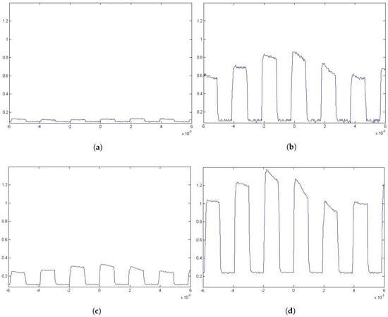 Subfigures (a,b) are measures taken from location T2 being (a) a case in which the windows are present between the emitter and the receiver and (b) a case in which the windows are not present between the emitter and the receiver. Subfigures (c,d) are measurements taken from location T4 being (c) a case in which the windows are present between the emitter and the receiver and (d) a case in which the windows are not present between the emitter and the receiver. In all cases, the positions are as defined in Table 2. Vertical axes denote power in nW and the horizontal axes denote time in s.