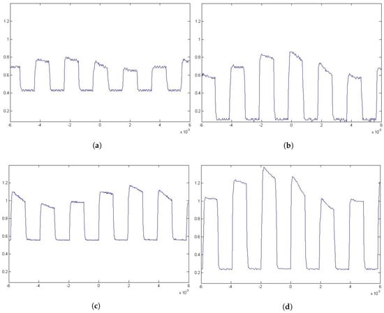 Captures of the signal from diferent locations: (a) at T1; (b) at T2; (c) at T3; and (d) at T4 as defined in Table 2. The emitted signal used an On-Off keying with non return to zero (OOK-NRZ) modulation scheme at a 512 bps data rate.