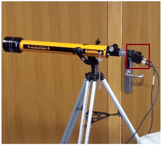 On the receiver side, a telescope was used to increase the gain of the receiver. The gain from the telescope () was calculated using Equation (12). The telescope had a lens with a diameter () of 60 mm. The area in which the light was projected had a diameter of 16 mm. This configuration resulted in an approximated gain () of 14.0625: