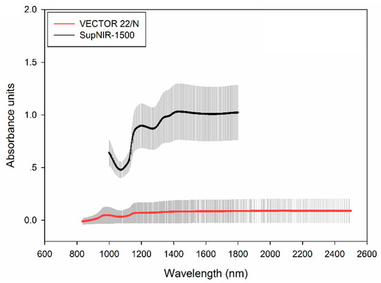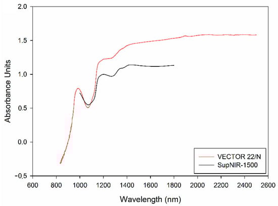 - A benchtop Fourier transform (FT) spectrometer (VECTOR 22/N, Bruker Optics, Germany), equipped with a deuterated triglycine sulfate detector (DTGS) detector covering the spectral range from 12000 to 4000 cm−1 (833–2500 nm), and the spectral resolution of this spectrometer is 3.858 cm−1.