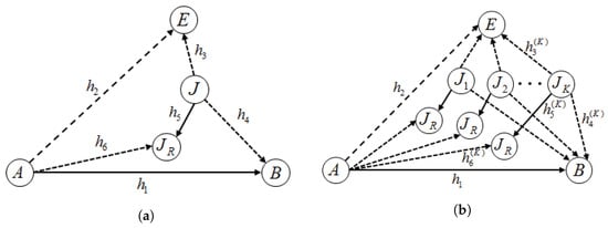 We first consider a wireless network that consists of two source-destination pairs and an eavesdropper: , and E, respectively, as shown in Figure 1a. The system with multiple jammers (in Figure 1b) is investigated in Section 4. Alice (A) and Bob (B) are primary legitimate users where primary source Alice is allocated radio resources such as a unit time slot and transmit power to send its own data to Bob. On the other hand, secondary source Jack (J) has been partly allowed to access the time slot only if it does not degrade communication quality between the primary users by certain collaboration to be defined below. Eve (E) is another party that is eavesdropping the primary communication. We assume that Eve does not care about Jack’s messages and treats it as interference.