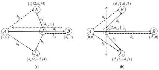 Network models used in the simulation: (a) the jammer moves horizontally; (b) the jammer moves vertically.