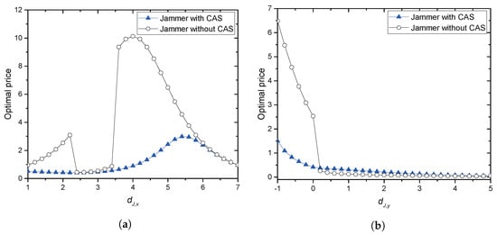 Optimal prices. (a) the jammer moves horizontally; (b) the jammer moves vertically.