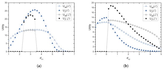 Figure 5a,b provides the utility values obtained by the collaboration, which is established by the prices obtained in Figure 3a,b, respectively. In both of the figures, it is seen that if Alice and jammers share CAS, then they have a significantly positive benefit at more positions than without CAS. For Figure 5a, significantly positive benefit for the collaboration without CAS is possible if it is between and . With CAS, the range is widened to and in the tested scenario. In Figure 5b, the collaboration without CAS cannot achieve a positive benefit if Jack is closer to than to Eve. With CAS, there is no limitation on the collaboration. It is noted that the absolute values of the utilities are hardly compared since scale factors for the rate and the power are given arbitrarily for the simulation.
