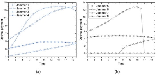 In Figure 6a,b, optimal with each jammer at each time instant is illustrated. Jammers tested are indexed as and , among which are low-speed jammers and are high-speed jammers. In Figure 6a, as time elapses from one to 20, optimal payed by the jammers with CAS is plotted according to the movement. At the beginning, Jammer 2 is the best one that is willing to pay the most, and Alice would agree to the collaboration with Jammer 1. At Time Instant 5, Jammer 1 would pay more than Jammer 2 and be possibly selected as the collaboration partner until Time Instant 18. Jammers 3 and 4 have no chance in participating in the collaboration and to access the channel to send their own data. In Figure 6b, the payment by jammers without CAS, but with the same trajectories used, is plotted. In this group of jammers, Jammer 6 (on the same path with Jammer 2) enjoys the collaboration until Time 16, and Jammer 8 takes it from Time 17 to 20. Even on the same trajectories, the selection looks different. Jammer 1, the most frequently selected one if it has CAS, hardly has found a chance for collaboration without CAS.