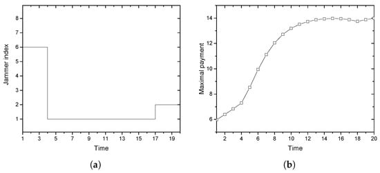 Figure 7a,b summarizes the selection result from Jammers 1 through 8 investigated in Figure 6a,b. In Figure 7a, the selected jammer is illustrated at each time instant. Until Time 3, Jammer 6 without CAS is selected. After Time 4, Jammer 1 and then Jammer 2 are selected, both of which have CAS. The resulting payment is illustrated in Figure 7b. It shows a , and increase of the utility by Alice compared with a single jammer case of Jammers 1, 2 and 6, respectively.