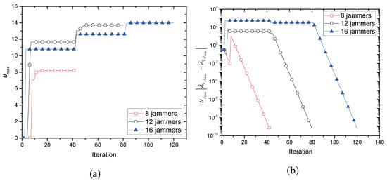 Figure 8a,b illustrates the convergence behavior of ICSP. ICSP with potential jammers is tested, respectively. In Figure 8a, (an updating variable that indicates the current greatest payment) is shown as iteration proceeds. , as expected, monotonically increases and almost approaches its maximum within around 15, 50 and 82 iterations with 8, 12 and 16 jammers, respectively. It is also seen that the increasing number of jammers provides a greater , which is increased by and with a 50% and 100% increase of jammers from eight, respectively. Figure 8b shows the maximum of convergence-testing metric used in ICSP. If , then ICSP terminates. It is seen that all three examples tested are terminated within around 23 iterations for and around 30 iterations for with eight jammers.