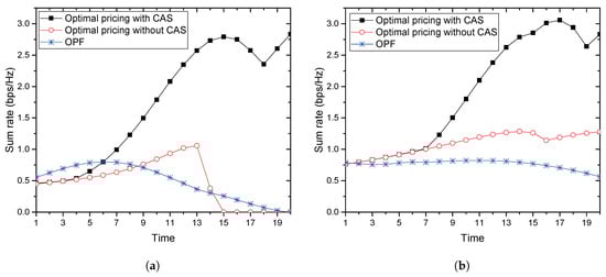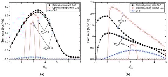 Figure 10a,b compares the sum-rates provided by the optimal price given in this paper and OPF in [5]. For Figure 10a, Jack moves horizontally from Alice to Bob as used in Figure 3a. In this case, OPF provides its maximal rate of 0.12 at , from which the rate goes down since Jack approaches Bob. The proposed pricing achieves maximal sum rates of 2.81 and 2.57 at and with and without CAS, respectively, when the secrecy rate target . When , the proposed method achieves maximal sum rates of 2.69 and 2.14 at and with and without CAS, respectively. It is thus seen that the sum-rate achieved by the proposed method is significantly greater than the sum-rate by the optimal power allocation if the collaboration is established. The collaboration however can fail when large is required especially without CAS. For Figure 10b, Jack moves vertically from to as used in Figure 3b. In this case, OPF provides its maximal rate of 0.39 at , to which the rate goes up since Jack gets close to Eve. The proposed pricing achieves maximal sum rates of 1.89 and 2.28 at and with and without CAS, respectively, when the secrecy rate target . When , the proposed method achieves maximal sum rates of 1.15 and 0.65 at and with and without CAS, respectively. In this figure, it is also seen that the proposed method can achieve the greater sum-rates if the collaboration is possible.