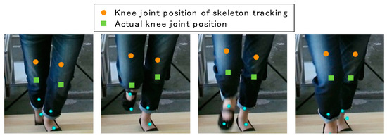 Knee joint position estimation during stair climbing. The knee joint positions detected by the skeleton tracking of Kinect v2 (orange circles) differ significantly from the actual ones (green squares).