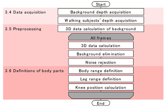 The flow of our method is shown in Figure 2. The method consists of three phases: data acquisition, preprocessing, and definition of body parts. The data acquisition phase was programmed in C++, and the other two phases were programmed in MATLAB 2017a (MathWorks Inc., Natick, MA, USA). These phases are completely independent and offline.