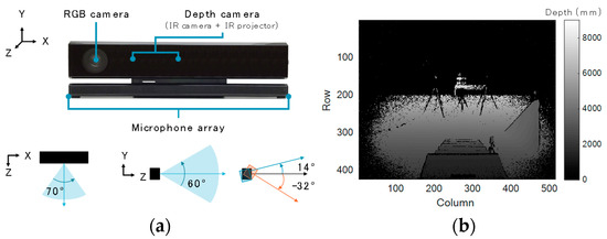 Kinect v2 is composed of an RGB camera, a depth camera, and microphone array (Figure 3a). It acquires RGB data, depth data, and IR data at 30 fps. It also has a skeleton tracking function and face tracking function. Its horizontal and vertical visual angles are 70° and 60°, respectively. Depth data can be obtained in the range of 500 to 8000 mm, while the skeleton tracking data can be acquired in the range of 500 to 4500 mm. Although Kinect v2 has no tilt motor, it can be tilted from −32 to 14°. The accuracy of the depth data acquired by Kinect v2 was evaluated [25]. It was found that the error was less than 4 mm in an elliptical area, with a 3.5 m major axis around the subject. We acquired depth data (Figure 3b) for our method and skeleton tracking data for comparison. As our system is supposed to be used in homes, depth data is more suitable than RGB data in terms of privacy. The dimensions of Kinect v2 are defined as follows: mediolateral = X, vertical = Y, and anteroposterior = Z. We will simply refer to “Kinect v2” as “Kinect” in what follows.