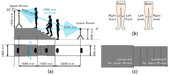 Although stair climbing has been observed from the side of the subject in most previous studies, Kinects had to be set at the front or the back in our study, because our system is to be used in living environments. To determine an appropriate position, two Kinects were used; the lower one was set at 940 mm above the ground and 2200 mm away from the stairs; the upper one was set at 1500 mm above the stage and 1600 mm away from the stairs. The tilt of the upper one was °, and the tilt of the lower one was °. The tilts and positions of the Kinects were determined so that the whole body of each subject was within the devices’ visual range. Also, the distance from each Kinect to the subject was within 4 m because of the limitation of the skeleton tracking function.