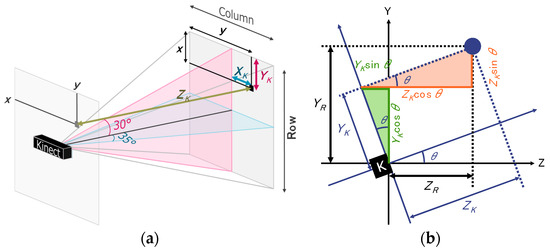 When the Kinect was tilted, a tilt correction had to be made to the Z and Y matrices. The method, shown in Figure 5b, used Equations (3) and (4).