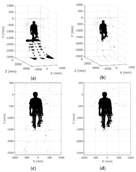 After that, the histogram of the Z matrix was calculated. The range that had the largest frequency except 0 was defined as the subject’s position on the Z axis. All data points that were farther than 500 mm from the subject’s position were deleted for noise rejection. Figure 6c shows the same data as Figure 6b after background elimination and before noise rejection. Figure 6d shows the result after noise rejection.