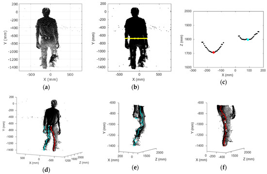 On the other hand, the left and right legs were relatively difficult to distinguish in the female subjects’ data, as the female subjects tended to position their legs closer together when they walked. Figure 12f shows an error caused by confusion of the left and right leg data. In this case, some of the left leg plots were misrecognized as right leg plots, and as the left leg was positioned ahead, the representative plots were defined incorrectly. In some frames, the left and right legs could not be separated by the vertical plane, so a more complex boundary plane should have been used.