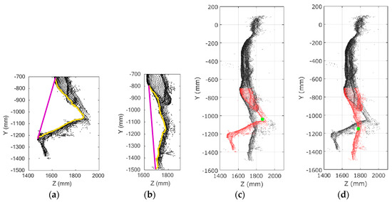 The knee joint position was defined as follows. Figure 8a,b show plots of the left and right legs in the Z-Y plane. The yellow lines in the figures express representative positions of the left and right legs at each height, and the purple lines connect the top and bottom representative positions. The knee joint position was defined as the point on the yellow line that had the largest distance from this purple line. Figure 8c,d shows the estimated knee joint positions as green dots and the leg areas as red dots.