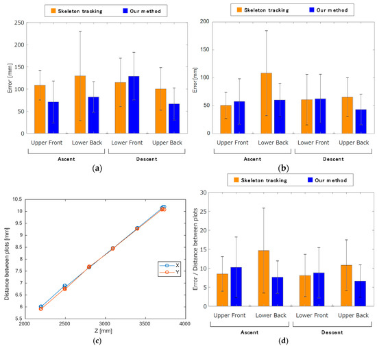 To consider the effect of resolution, the 3D error of each frame was divided by its resolution, as calculated using the equation above. Equation (17) was used for normalizing the 3D error because the distances of the X axis were larger than those of the Y axis. Figure 9d shows that the normalized 3D error of our method for both ascent and descent was the smallest when the data were captured from the back. Conversely, the skeleton tracking method showed better results when the data were measured from the front compared with from the back.