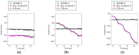 where Xerror, Yerror, and Zerror are the errors of the values estimated by our method compared with the VICON values:
