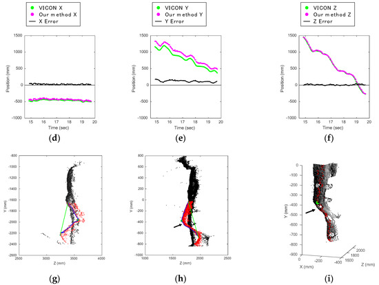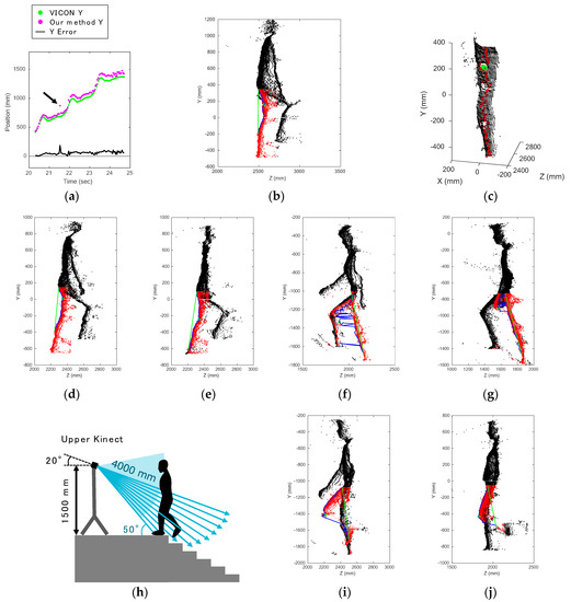 Figure 10h shows subject 6’s descent in the Z-Y plane captured by the lower Kinect. For comparison, Figure 10g shows the same subject’s descent captured at the same time as Figure 10h but with the upper Kinect. The green dot shows the estimated knee joint position, and the red dots show the leg area. In Figure 10h, the silhouette of the knee area is round. The leg area plots in 3D of the same data as in Figure 10h are shown in Figure 10i. The arrows in Figure 10h,i point to the correct knee joint positions, where the reflective marker of VICON was put. The data of plots for the reflective markers could not be acquired, so their positions appear as holes in the data in Figure 10i. According to the two figures, it can be seen that the estimated knee joint position (the green dot) is located above the correct knee joint position. It is hard to find the correct knee joint positions by finding the positions that are farthest from the purple line in Figure 8a, because the front silhouette of the knee area is round.