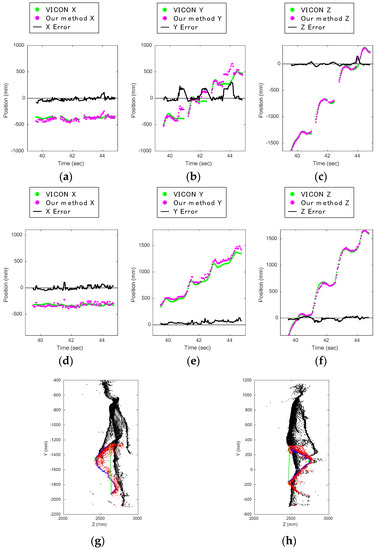 Figure 9a,b indicates that the lower Kinect had significantly poorer results and that its data had large bias errors. Figure 10a,c shows the knee displacements on the X, Y, and Z axes of a trial during a descent captured by the upper Kinect, and Figure 10d–f shows those captured by the lower Kinect. Comparing these figures, it can be seen that the plots of our method for the Y axis in Figure 10e of the lower Kinect are rather different. They are always higher by a certain amount than the VICON data.