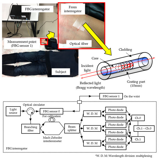 - Kawamura, M.; Ishizawa, H.; Sato, S.; Koyama, S. Application to vital signs by fiber Bragg grating sensing. In Proceedings of the SICE Annual Conference 2011 Final Program and Papers, Tokyo, Japan, 13–18 September 2011; pp. 2702–2704. [Google Scholar]