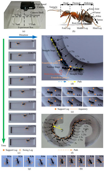 An ant experiment platform was carefully established and experiments planned for studying ant movement. The platform is shown in Figure 1a, and consisted of a high-speed camera, camera shelf, experiment box, and PVC board. Both the experiment box and camera shelf were made of transparent acrylic board so that it had little influence on the photography. The PVC board was placed in the experiment box and divided into four parts (“I” path for straight gait, “U” path for switching between straight and turning, “S” path for always turning and switching direction of turn, and free movement area). The ant moved in these paths and the gait and trajectory observed. To obtain a clear photograph, the high-speed camera was set at 240 fps. A Camponotus japonica ant [35] was chosen for the experiments, and is shown in Figure 1b. This type of ant has a big trunk and long legs. The whole body is nearly 10 mm long, and the leg more than 5 mm. This made it convenient to observe, and this structure has a wide movement space and high athletic performance [36]. The results of the experiments are described in detail below.