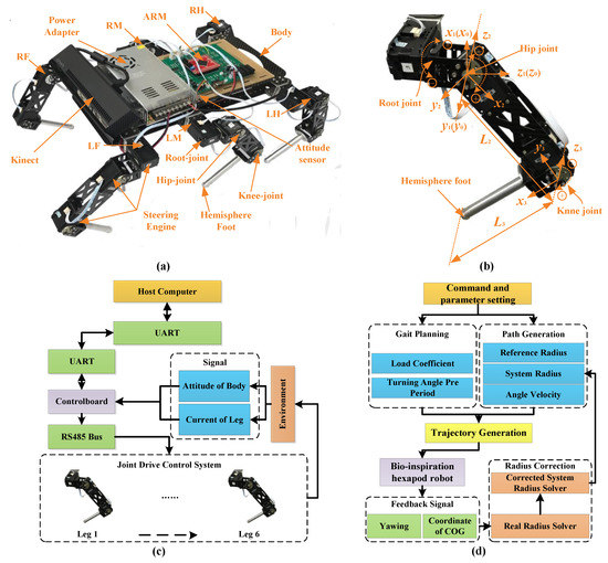 (a) Biomimetic hexapod robot; (b) Leg structure parameters; (c) Control diagram; (d) Algorithm framework.