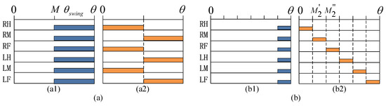where β is the duty factor. When the robot turns in tripod gait, the gait chart is shown in Figure 3b. The change from Figure 3(a1,a2) can be considered as the phase of swing moved to a special position. In this way, the planning of wave gait can be represented by Figure 3b. After moving, the start angle Mi’ and end angle Mi’’ of the swing phase of each leg are as follows: