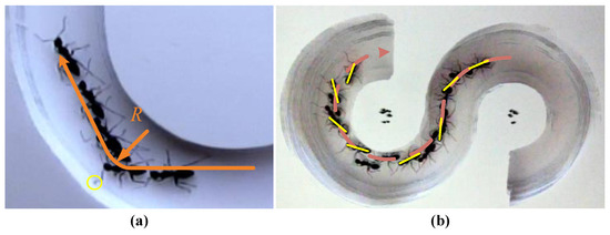 Straight motion is the simplest and most efficient form of movement for ants. Through our experiments, we found that regardless of the situation, an ant will first choose straight motion. The ant in the “U” path is shown in Figure 4a. Initially, the ant moved straight, which can be regarded as a turning with infinite radius. The yellow circle indicated that the tentacle of the ant had detected an obstacle and had momentarily deviated from the desired trajectory. Then, the ant began to adjust its turning radius. The radius adjustment of the ant in the “S” path is shown in Figure 4b where the dashed line represents the path and the yellow lines represent the body direction. It can be concluded that the ant was constantly adjusting its yaw angle during turning. In other words, it kept adjusting its radius as much as possible for the body to move along its trajectory. Therefore, the path correction of an ant is completed by adjusting the radius.