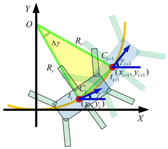 A sketch of the radius calculation is shown in Figure 5. Supposing that the robot goes to the Ci point at the time of ti, and reaches the Ci+1 point at the time of ti+1. The feedback signals at the time of ti and ti+1 are the yaw angle (γi, γi+1) and COG coordinate (Ci = (xi,yi), Ci+1 = (xi+1,yi+1)), respectively. An isosceles triangle was developed by constructing auxiliary lines through the two points Ci Ci+1 and was perpendicular to their direction of yaw. The two auxiliary lines intersected at the O point. The line OCi was the real radius in this period. According to the cosine theorem, the real turning radius is: