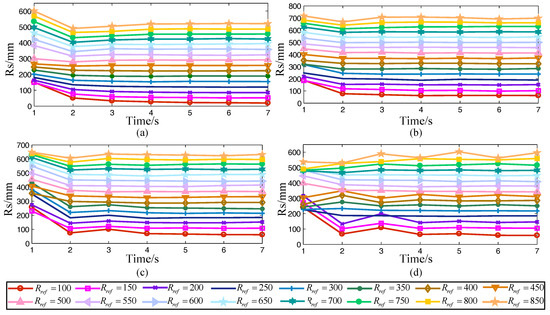 The curves of the system radius under different reference radiuses and duty factors (β = 1/2, β = 3/4, β = 4/5, and β = 5/6) during the correction are shown in Figure 6.