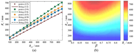 Regardless of the duty factor and the reference radius, after correction, the system radius will eventually converge at a certain value. Taking the data after stabilization and calculating their average, the average system radius was obtained. After that, taking the average system radius as the abscissa and the corresponding reference radius as the ordinate and fitting them together, the fitting curve is shown in Figure 7a. The equation is: