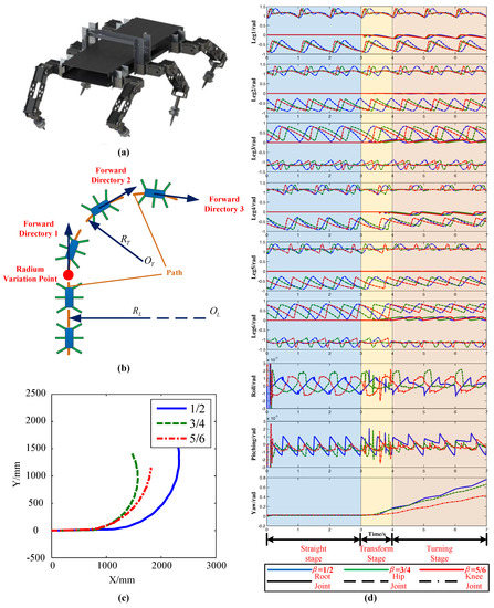 For a legged robot, one key point is to reasonably plan the desired movement of each leg to achieve smooth locomotion. The turning gait has strong expansibility, and can produce abundant movement forms. When the radius is sufficiently large, the turning path can be regarded as a straight line [6]. Fortunately, any possible path can be supposed as arcs and lines. Hence, the study of turning is an important part of legged robots. Some scholars have proposed a turning algorithm based on a single gait [7,8] and precise motion control [9,10]. According to the relative motion between foot tip and body, the function of foot tip was obtained to make the robot follow the desired path. However, this algorithm only can make the robot turn with a specific gait and does not contribute to the adaption of different terrains.