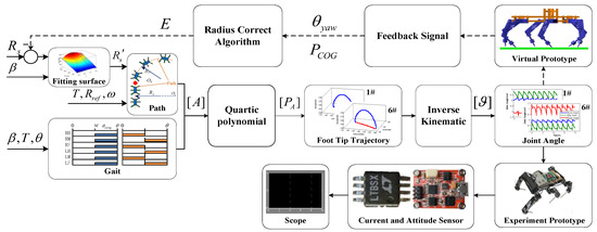 The framework of the control strategy is shown in Figure 2d. The whole system was composed of a command and parameter setting, gait planning, path generation, foot trajectory generation, experimental prototype, feedback signal, and a radius correction algorithm. The command provided the input for the control system. Gait planning was controlled by the gait parameters and turning angle in a period. Additionally, path generation was controlled by the reference radius, system radius, and turning angle velocity. At the beginning of correction, the system radius equaled the reference radius. The robot then adjusted the system radius to eliminate the deviation. When the deviation was 0, the system radius converged to a value. It was regarded that the system radius was a parameter that drove the robot to obtain the desired real radius. Together, the gait planning module and the path generation module generated the trajectory of the foot tip. Through the inverse kinematics, the control signals of each leg were obtained to drive the robot. The feedback signals of the yaw angle and COG coordinates were transmitted to the radius correction algorithm module and system radius was calculated. The whole algorithm architecture was in closed loop control and could achieve different movement forms according to the parameters.