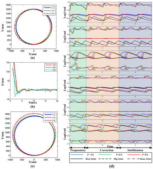 According to the analysis above, as long as the radius is changed, the transition between the turning and straight can be achieved. However, it will cause irregularity in the signal of each joint when the motion parameters are changed suddenly. At the same time, that will lead to discontinuity in the foot trajectory and reduce stability. If the strategy of the transition radius is adopted slowly, although the influence on stability is reduced, the transition time is too long, which is not good for the robot’s speed of response. Therefore, a transition strategy that satisfies rapidity and stability was proposed. By imitating the switch method of an ant, as long as the moment of switch is controlled in the swing phase and finished before touching down, the switch could be achieved instantaneously and guarantee stability.
