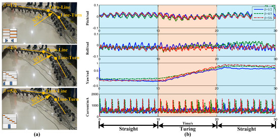 Straight-turning-straight experiment. (a) Image of different gait; (b) Attitude data and current data.