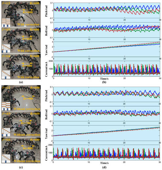 Comparison experiments on radius correction algorithm (reference radius Rref = 600 mm). (a) Images of different gaits (radius correction); (b) Attitude data and current data (radius correction); (c) Images of different gaits (without radius correction); (d) Attitude data and current data (without radius correction).