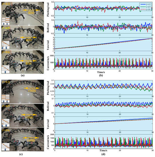 A comparison test of the radius correction algorithm was carried out where the reference radius was Rref = 600 mm and duty factors were 1/2, 4/5, and 5/6, respectively. The graphs showing turning with the radius correction algorithm are presented in Figure 12a. Using the floor tile as a reference, it was concluded that the real radius was approximately the same as the reference radius. Figure 12c is the stack graph without the correction algorithm under the same conditions as Figure 12a, where it was obvious that there was a large error of the real radius and the reference radius. The corresponding attitude data and current data are shown in Figure 12b,d. The range of pitch angle and roll angle were less than ±0.1 rad. The variation of yaw angle was an oblique line. The robot roughly turned 4 rad in 30 s. This showed that the stability of the robot was not greatly affected by the radius correction algorithm. The period of the current curve was 1 s, which was identical to the period of gait. According to these curves, the radius correction algorithm could effectively correct the turning radius error, and had almost no influence on the stability and energy consumption of the robot.