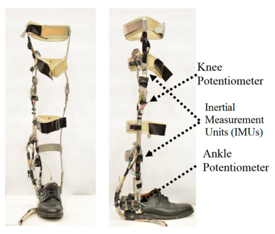 A metal-frame knee-ankle-foot orthosis [8] was instrumented with 14 sensors embedded in the frame of the orthosis. The chosen sensors were selected to monitor the kinematic segments and joints of the orthosis. Two inertial measurement units (IMUs; IDG500, Sparkfun Electronics, Niwot, CO, USA) each having a three dimensional accelerometer (ADXL335, Sparkfun Electronics, Niwot, CO, USA) and a two dimensional gyroscope (IDG500, Sparkfun Electronics, Niwot, CO, USA) were installed on the thigh and shank segments. The knee and ankle joints contained a rotary potentiometer to measure the angles. Force sensors in the shoe insole (Interlink Inc., Westlake Village, CA, USA) measured the contact force between the foot and ground. Figure 1 shows the sensors installed on the orthosis frame.