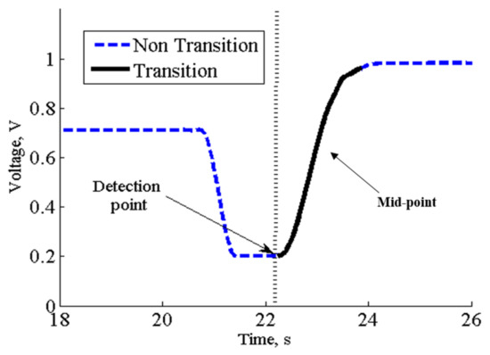 Signal waveform of knee potentiometer during a sit-to-stand activity; dashed and solid lines represent non-transition and the sit-to-stand transition period respectively.