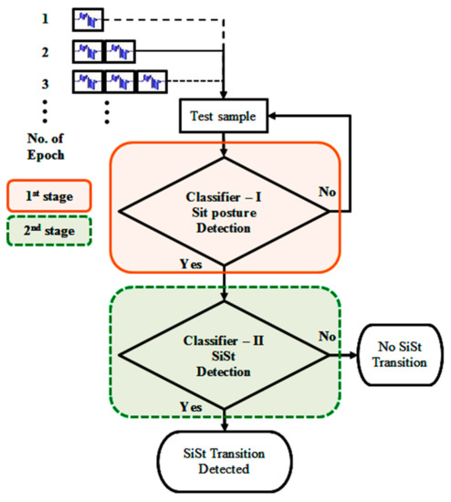 Multistage hierarchical algorithms are well known in the field of machine learning and pattern recognition [34]. Previous related works [20,21,22,23,24,25,26,27,28] that primarily consider improving the accuracy of the transition detection did not, however, necessarily separate out the issue of false positives. In this paper, a new technique was proposed for both the detection of SiSt transitions and, especially, the elimination of false positives. The SiSt recognition utilized two stages of classification (Figure 3). In the first stage, the classifier detected candidate classes of “sitting posture” and in the second stage, the classifier determined whether a SiSt transition occurred or not.