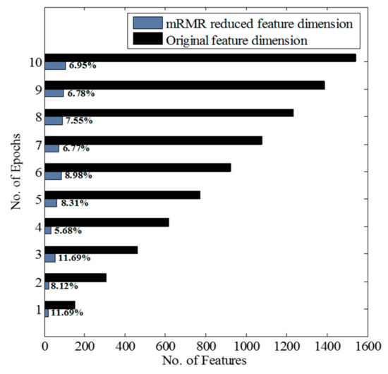 The minimum Redundancy Maximum Relevance (mRMR) [31], which is a feature selection approach based on mutual information, followed by Forward Feature Selection (FFS) was used to reduce the number of features used in SiSt detection. The relevance in the mRMR method is described in terms of mutual information as in Equation (2). In the case of maximum relevance of a feature set with features {}, the selected features and target class are necessary to determine the mutual information . The largest mutual information implies the largest dependency on the target class. During a sequential search, the top best individual features were then selected as Equation (3), based on the descent ordering of mutual information .