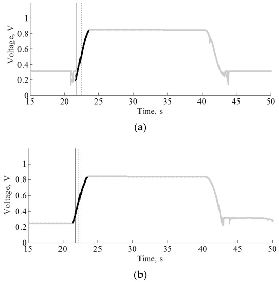 Activity mode of knee potentiometer of two different activities with different trials. Black solid lines represent detected transitions (a) activity-2 trial-6; (b) activity-6 trial-22.