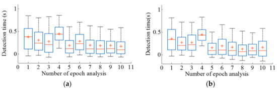 Box plots for detection times obtained from both algorithms: (a) ELM classifier; (b) MLP classifier.